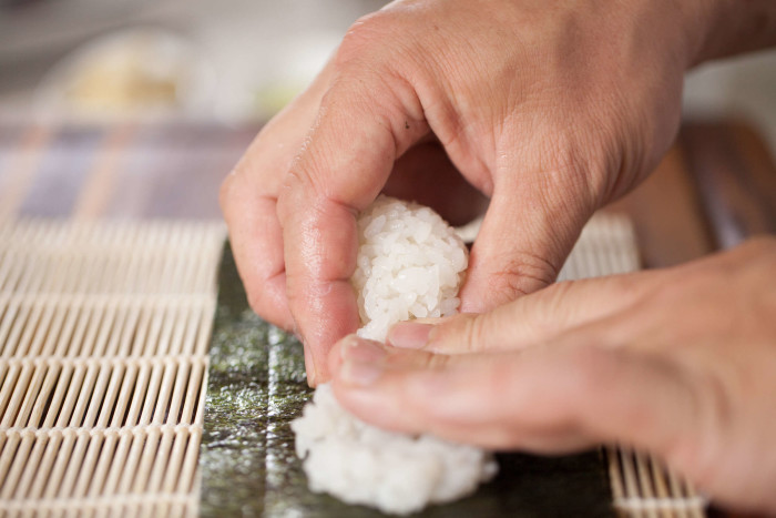 2. Moisten your hands with water to prevent the rice from sticking to them. Lay down a sheet of nori, rough side up, with one of the longer edges nearest you. Form a loose ball of 50 grams of sushi rice and spread it across the center of the nori, leaving a small space along the far edge. Move quickly to prevent the nori edges from curling.