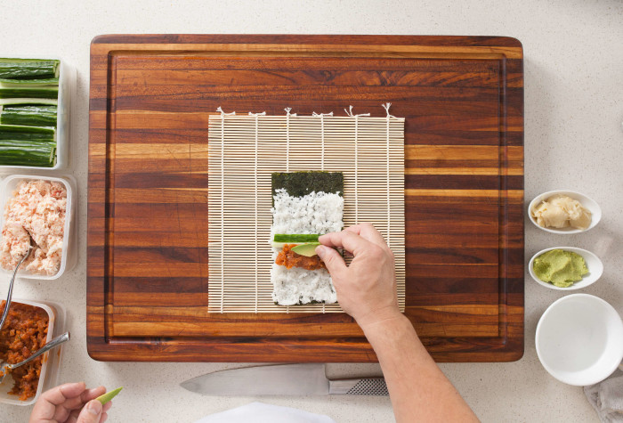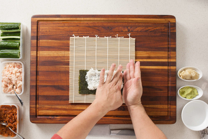 2. Set up your workstation in advance to make creating party-starting rolled sushi a breeze. To make any of these rolls at home, you'll need a cutting board, a bamboo rolling mat, a chef's knife, some lukewarm water, and some pickled ginger, wasabi, sushi rice, and fishy fixins.