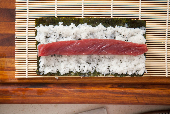 2. Lay 25 grams of fish and 20 grams of vegetables horizontally across the center of the nori. Be sure not to overstuff — you've gotta make this thing roll!