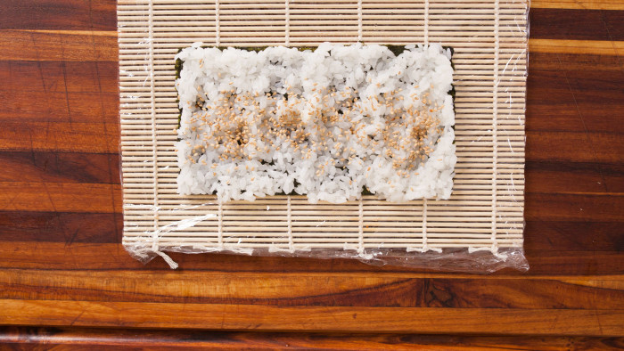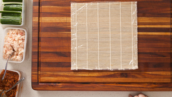 1. Wrap your bamboo mat in plastic to prevent the rice from sticking to it. Then lay the nori down rough-side up on the near side of the mat, with one of the long edges nearest you.