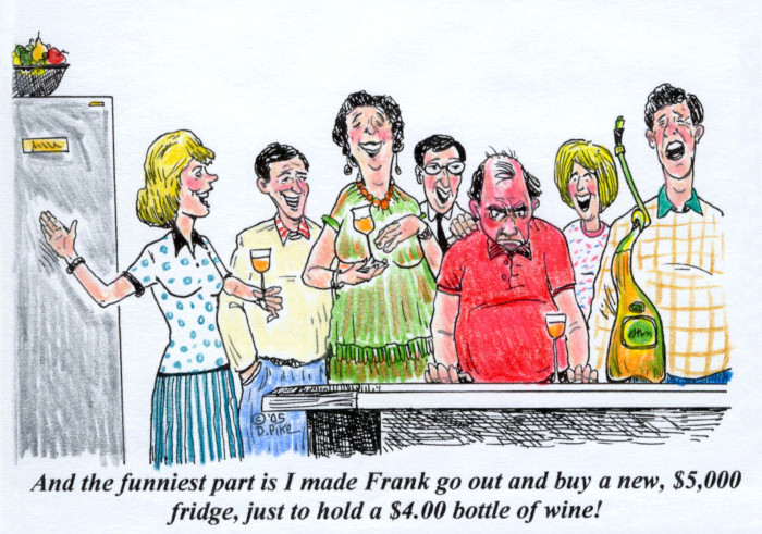 Cartoonist Doug Pike pours a little humor with his wine. The coauthor of a book of wine cartoons (with a foreword by legendary wine critic Robert M. Parker Jr.), Pike effectively takes any pretense out of wine drinking by illustrating miniature stories we can all relate to. Look for more cartoons from the book in the weeks to come. And for the amateur wine enthusiast thinking of getting a wine fridge, a regular fridge will chill your cheap-o wine quite nicely.