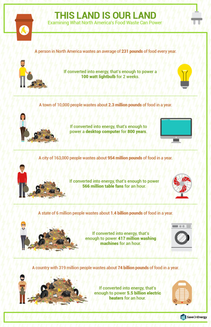 Save on Energy, an online marketplace that helps consumers shop for electricity and natural gas, posted a graphic that maps out just how much power could be generated by converting food waste into electricity. While this technology exists and is very efficient, it's still not widely used.
