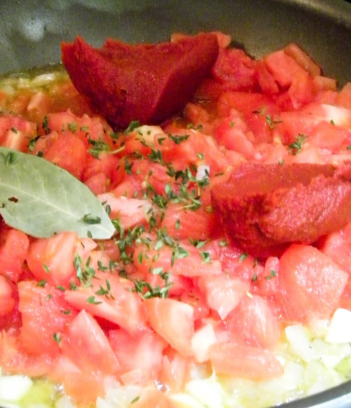 In a medium-sized sauce pot, place the olive oil over medium heat and sauté the garlic and shallots for about 5 minutes, being sure not to brown. Add the tomatoes, tomato paste, bay leaf, thyme and sugar. Turn the heat down to medium-low and cook for 1-2 hours stirring frequently until thick enough to coat the back of a spoon. Remove from heat and set aside. Discard the bay leaf.