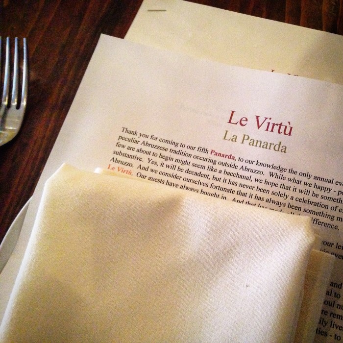 10:01 p.m.: Somewhere amid the haze of a heavy food coma, Cretarola begins pouring a digestivo called genziana. Traditionally, he tells me later, it is made from the root of the gentian plant, which only grows at high altitudes. But it is impossible to find the Abruzzese variety here in the States, so chef Cicala uses the Swiss and French kinds to make the house version at Le Virtù. Only after sipping this zippy liquid and a couple of espressos do I finally feel confident enough in my abilities to pry myself out of my seat. It was a fun ride, but gastronomically exhausting.