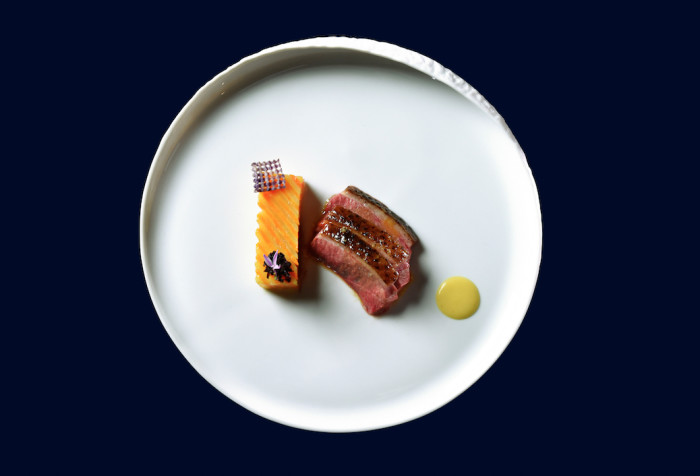 "My career has spanned a lot of different styles of food," Lienhard says. "I find food to be more like an art, so I wanted to work for people with that same viewpoint." Lienhard's dish was an homage to his career thus far, incorporating citrus from California, smoked duck from his home state of Michigan and a classic French layered potato pavé. His plan was to meld French technique with distinctly American ingredients and present his creation in a minimal but poignant way. "His dish is classic: It looks simple, but there is a complexity there — America is complex. He brought the American components to the front, and I'm very proud of that," notes Crenn.