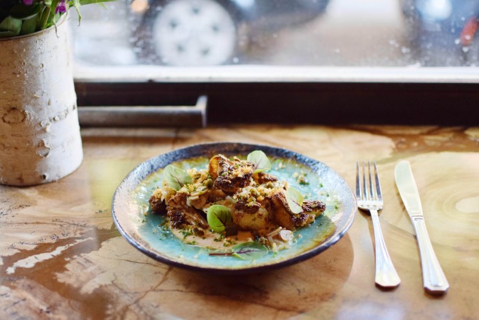 The scorched cauliflower, with toasted garlic, fried capers and cauliflower purée, had an enticing nutty taste, but best of all was the broccoli in a sticky General Tso sauce with cashews, sweet potato, bok choy and snow peas. Never again will I doubt the power of pure vegetables.
