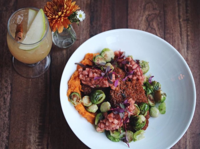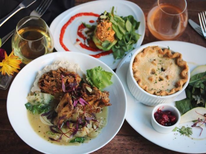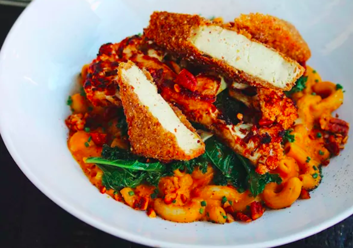 If you've never tried seitan, the protein-packed wheat-meat vegans love, go for the chops and applesauce. Cooked til crisp, there's a satisfying crunch when you bite into the rosemary breaded chops. It's complemented by pink applesauce, seared Brussels sprouts and sweet potato mash. The creamy red pepper cashew macaroni is perfectly offset by blackened cauliflower, sautéed kale, and crusted tofu; rich, velvety and piquant, it's incredibly moreish.