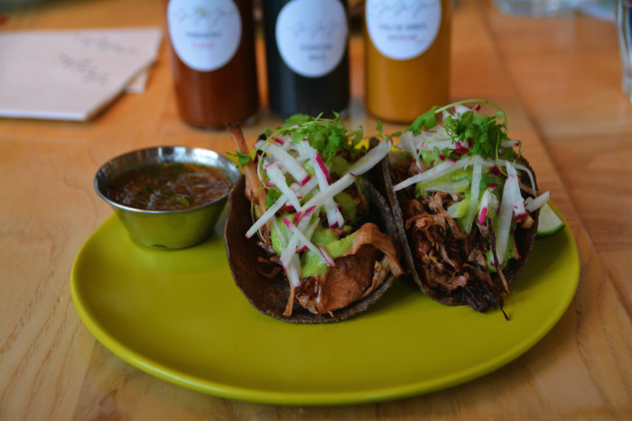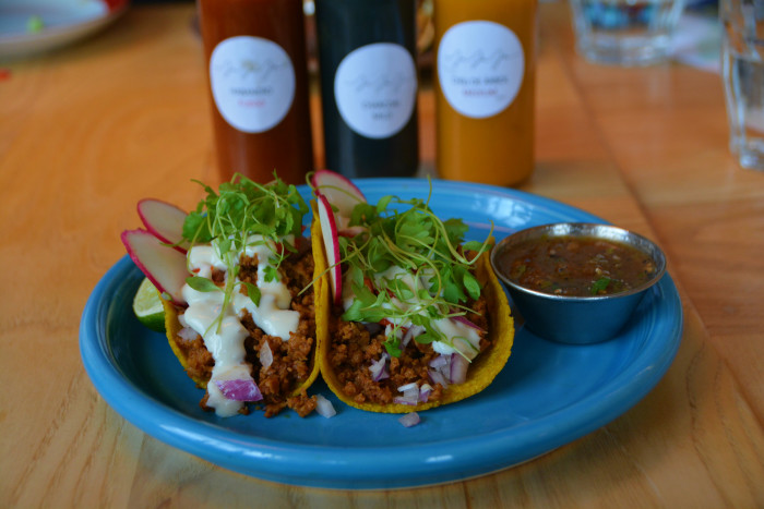 The dinosaur kale with mango, avocado, red quinoa, shallots, jalapeño and chia is a satisfying mix of tastes and textures. It crunches and pops enjoyably in your mouth, and the chili adds a bracing jolt to the sweet and savory flavors. Best of all are the "chorizo" tacos, served on turmeric tortillas and stuffed with crisp radishes, red pepper, onion, vegan sour cream and seitan chorizo, which looks and tastes just like spicy ground pork. Seriously divine.