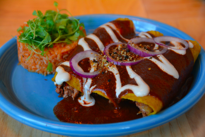 Also exceptional are the palm carnitas tacos (blueberry and flaxseed tortillas packed with hearts of palm, pulled jackfruit, salsa verde and greens); the mezcal mushroom tacos (tomato and beet tortillas filled with portobello and beech mushroom, cashew cotija, bell pepper, red cabbage, pico de gallo and sour cream); and chipotle sweet potato (turmeric tortilla with fermented beans, serrano, scallions and pickled red pepper).