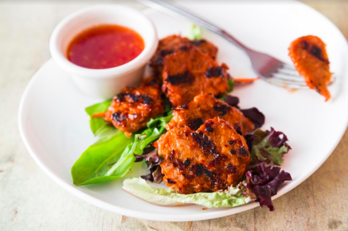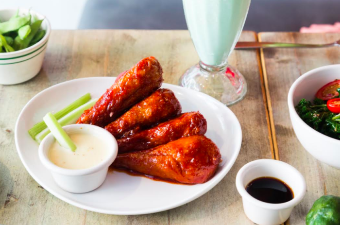 Some of the best starters include the succulent Caribbean jerk-spiced seitan – grilled seitan skewers marinated in a spiced lime-citrus dressing – and the Creole soul chicken – soy "chicken nuggets" panko-breaded with Cajun and rosemary seasoning, then fried and served with smoky hickory dressing.