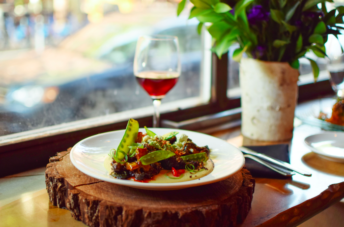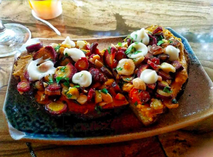 Choose from the romesco toast, where carrot, piquillo, marona almond and garlic purée are spread atop a doorstep-thick slice; the artichoke toast, which is topped with creamy-yet-zingy spinach and artichoke purée, cashews, jicama and black truffle vinaigrette; or the cremini mushroom with sweet onion marmalade, toasted walnuts, grapes and herbs de Provence. The flavors are perfectly balanced, and you can taste every note and nuance.
