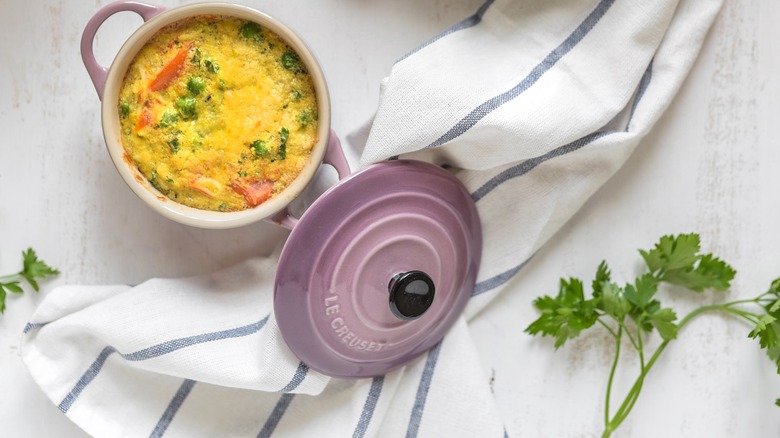 It's not hard to see why the round oven is a favorite of Ina Garten's. Beyond the obvious fun perks — namely, the plethora of vibrant colors to choose from — the Dutch oven's versatility in the kitchen has made it a household staple for many. Despite its relatively high price tag of $420, it offers more bang for your buck because its uses extend far beyond simmering soups and stews. For one thing, Le Creuset is actually two pans in one. Unscrew the handle on the lid, flip it over, and you have yourself a second pan, which makes for a pretty stellar baking sheet.