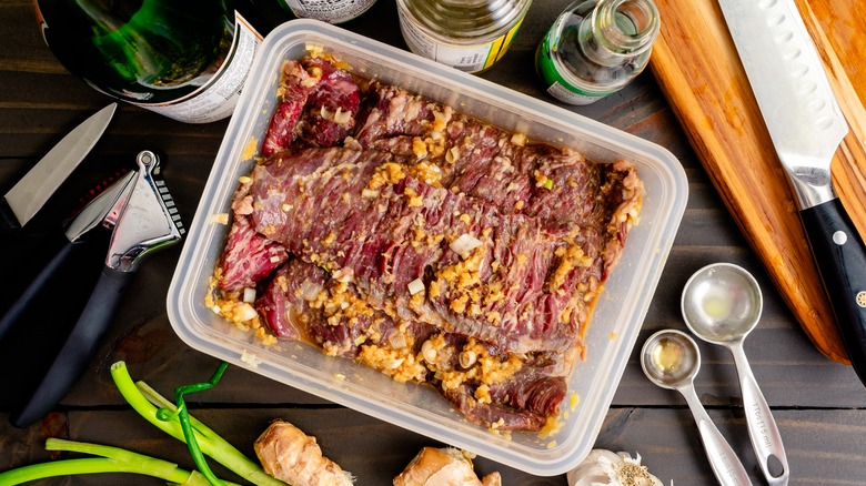 While Marc Marrone believes that the cut of steak you use is important, he also gave us tips to get the most flavorful result. The first step after choosing your meat? Your marinade, of course. "People tend to buy a lot of protein but do not make enough marinade or seasoning," Marrone explained. "Don't be shy with it, it will help you in the long run when cooking the bulk amount of proteins."