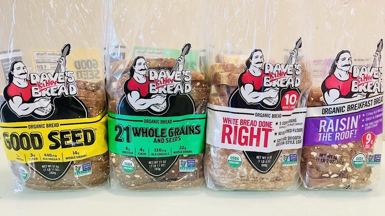 Variety is one area where Ezekiel Bread undoubtedly comes out on top. Not only does Food For Life make more flavors of the actual bread, but it also offers a whole slew of other bread products, too. Before I get ahead of myself, Ezekiel sliced bread comes in a whopping 16 different flavors, which, as you'll find out coming up, is far more than Dave's Killer Bread. Food For Life also makes three buns and rolls, eight english muffins, two pocket breads, and even six types of tortillas. So yeah, it's got quite the lineup of bread products.