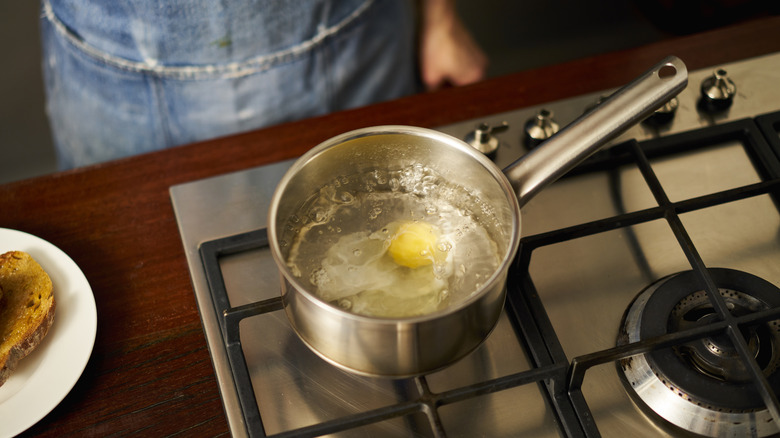 To perfect your breakfast craft, you don't need fancy ingredients or equipment. All you need is a humble, deep-bottomed ladle. Coat the ladle with non-stick cooking spray and crack the egg into it. Then lower the ladle into the pot, allowing the simmering water to gently cascade over the egg. Don't dunk the ladle completely — the influx of water would be too aggressive and could ruin the texture. Letting the water get too hot is another mistake everyone makes with poached eggs, so make sure to keep it at a gentle simmer rather than a rolling boil.