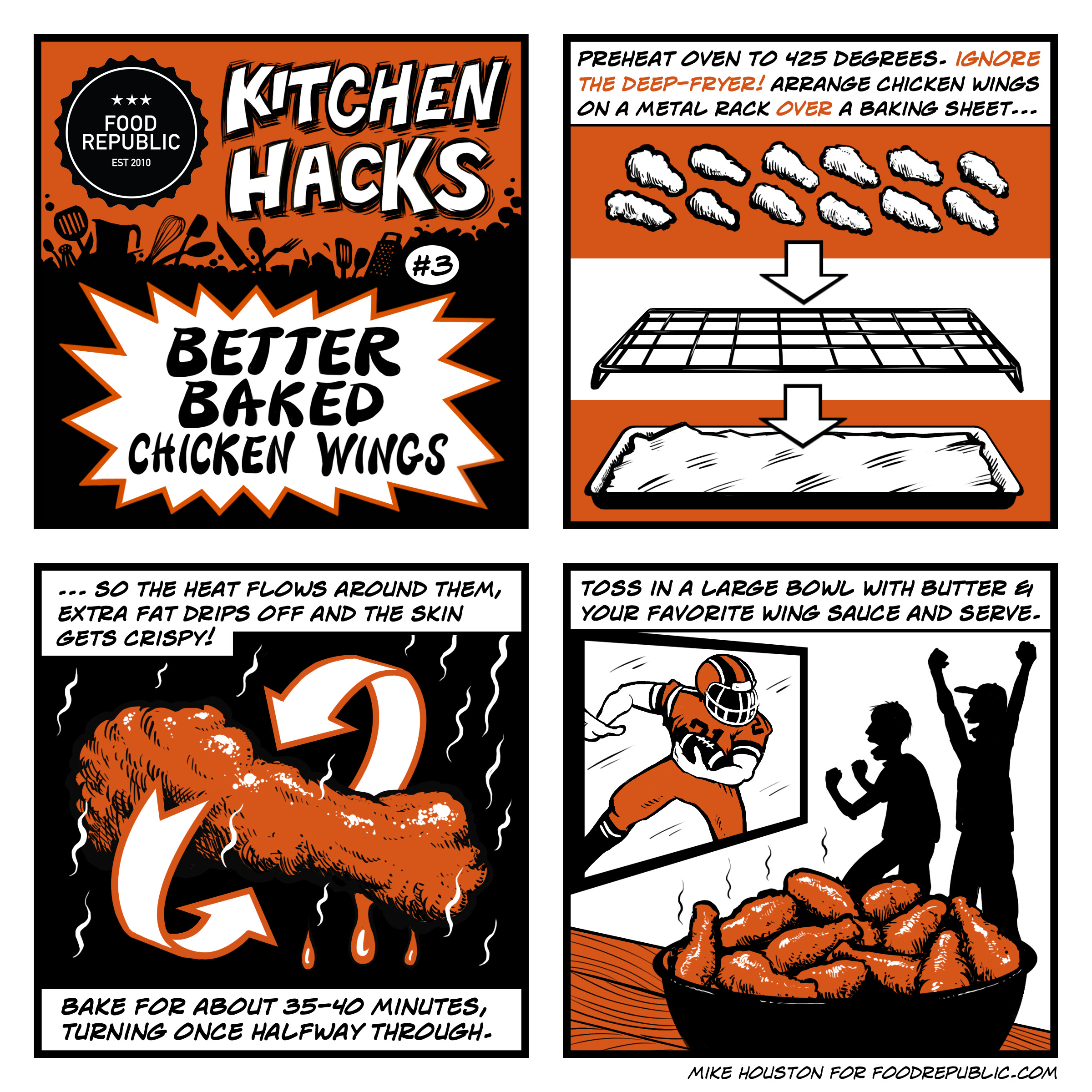 Welcome to Illustrated Kitchen Hacks. Just in time for the big weekend, here's how to make crispy baked chicken wings, presented in this easy-to-use visual format. Here are a few other hacks that may prove useful. Now you have absolutely no reason, including a short attention span, not to fire up a custom batch of wings for your viewing pleasure.
