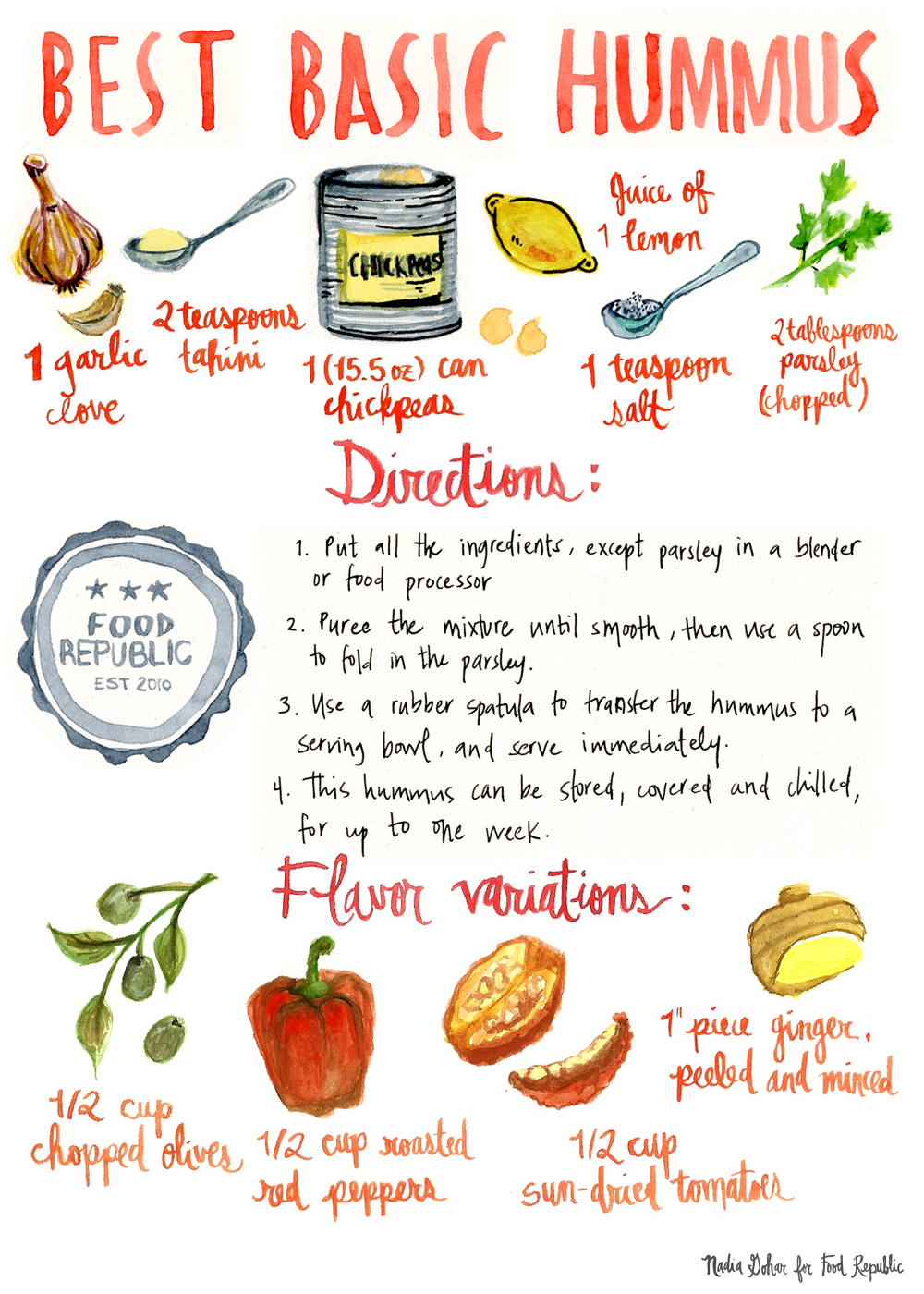 We commissioned Toronto-based designer Nadia Gohar (yes, we are sisters) to illustrate our favorite hummus recipe, along with four classic variations. Follow the instructions painted below, then add one of the suggested twists to further enhance your homemade hummus. And hey, if your fridge is looking boring, print these attractive guides and tape them on the door for an instant kitchen décor upgrade/reminder of how to make a great snack.