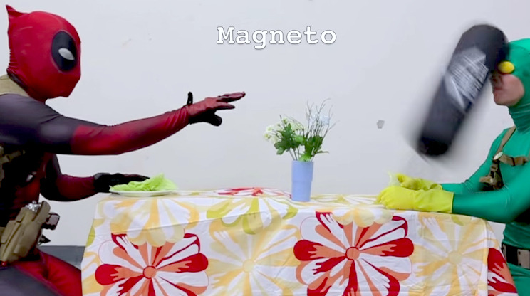 I can't imagine you'd want to eat at all if you're wearing an unforgiving Spandex superhero costume, but if you're going to, make it straight-up lettuce to avoid unsightly bulges. Now, watch Deadpool and ...that random green dude (I've just been informed by Nerdy Office Insider that he's "Bob, a Hydra agent") enjoy lunch like real mercenary heros/anti-heros/couldn't they have just done this with Spidey?
