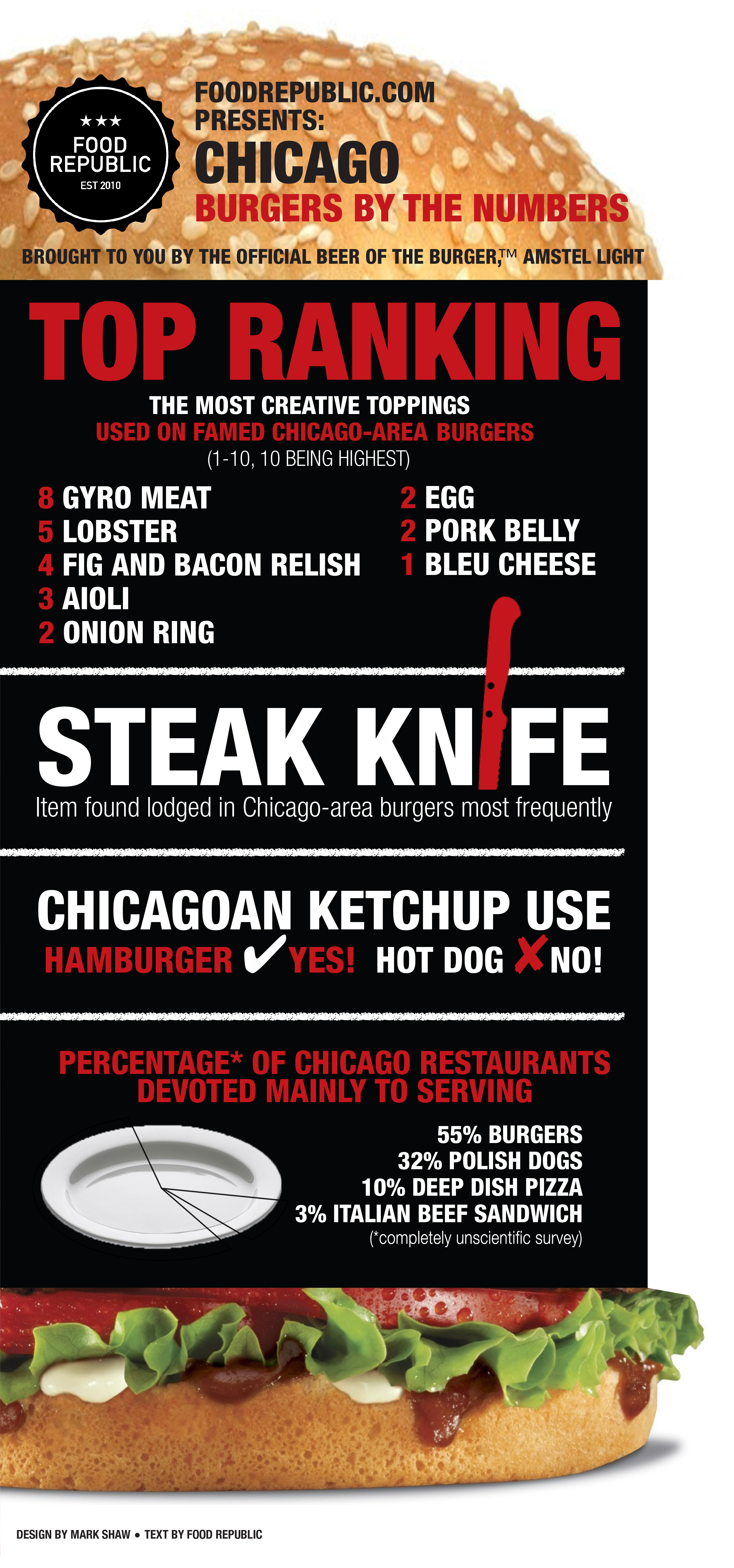 Chicago gets a lot of attention for its pizza and hot dogs. And we're not hating on that. We love ourselves some deep dish and Chicago-style wieners. But the fact remains that the city's burger scene is equally as impressive. Did you know that a larger percentage of its restaurants are devoted mainly to serving burgers than to Polish dogs or deep dish pizza? Even better, you won't even get dirty looks when you reach for the ketchup. Here Food Republic presents a handy infographic on all things burger from the Windy City. This post is brought to you by sponsor Amstel Light — the official beer of the burger.