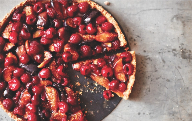 This is a quick, fuss-free, easily adaptable dessert, perfect to serve at a summer dinner party. The toasted almond and salt-kissed crust, maple roasted figs, and fresh raspberries topped with organic whipped cream makes for an all-around hit. Most of the ingredients here can be found in a well-stocked pantry, so all you need to do is pick up some fruit or roast what you have on hand, and this tart comes together in a flash. When figs are not available, try making it with roasted pears, or roast summer fruits like nectarines, peaches, or apricots — they all go well with raspberries and taste great with the almond crust.