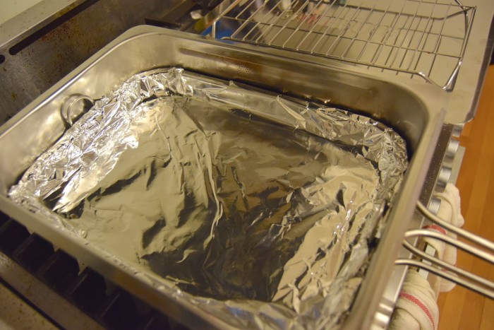 Step 3: Line the drip tray with foil for easier cleanup (optional but recommended), and set on top of the wood chips.