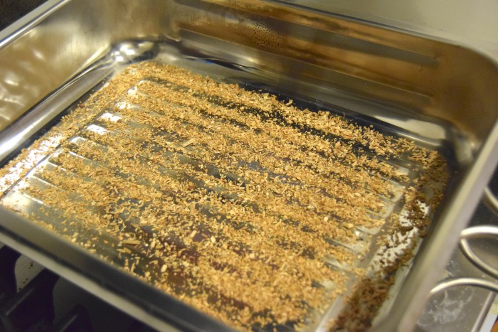 Step 2: Lay the wood chips out along the bottom of the main pan; you'll notice that the wood chips I used are chopped up into really small pieces, and that's what you're going to want to use here. If you use big chips, the rest of the apparatus won't fit together properly, and you also won't get the level of smoke you need.