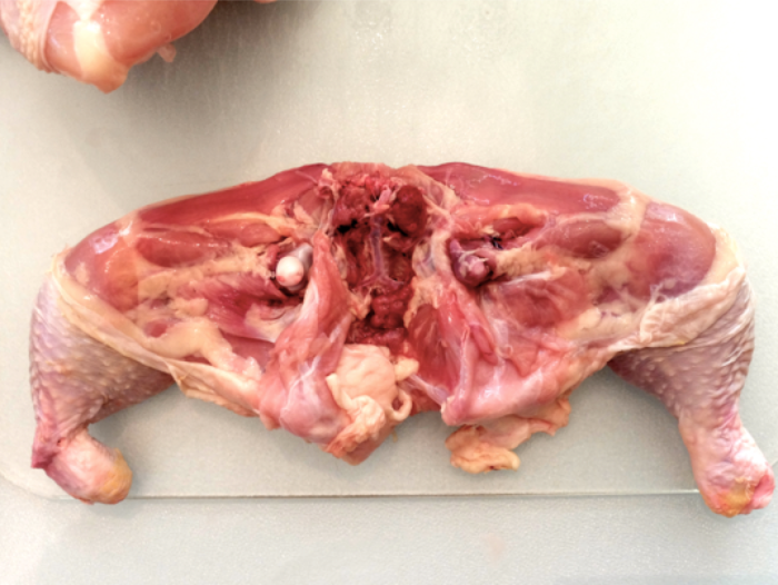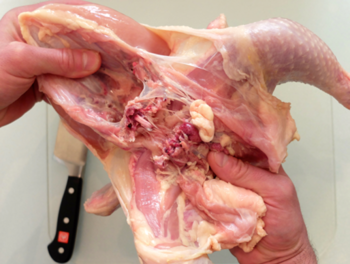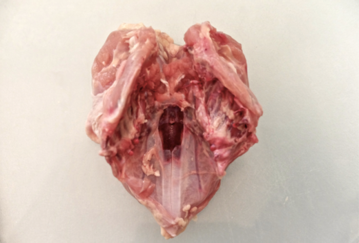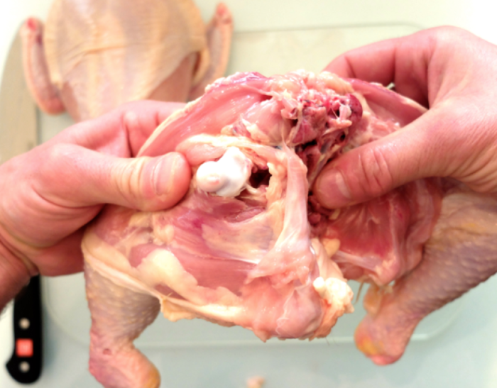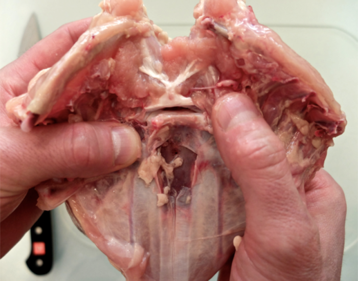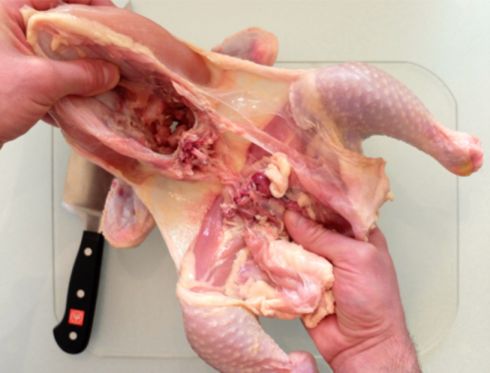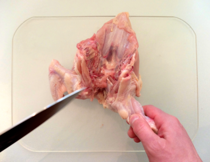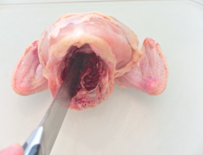 Now simply repeat the step above for the other side, cutting through the skin between the leg and the breast, down to the backbone, exposing the cavity.
