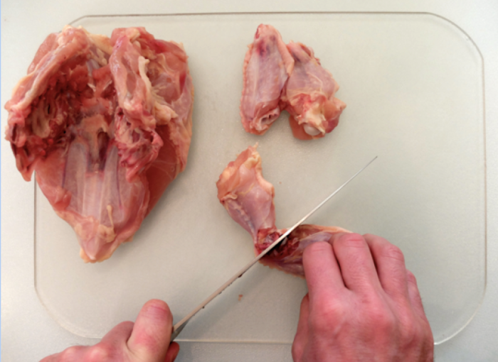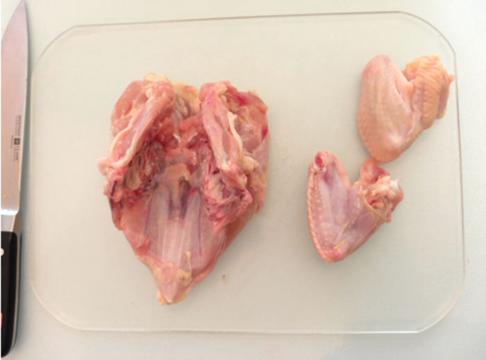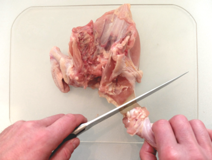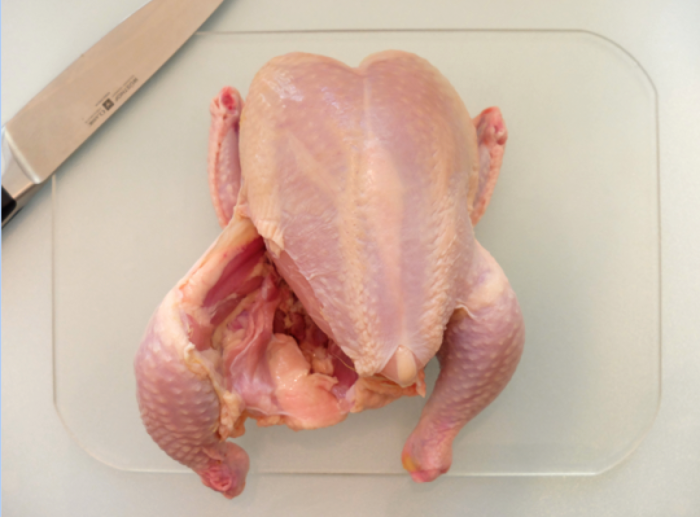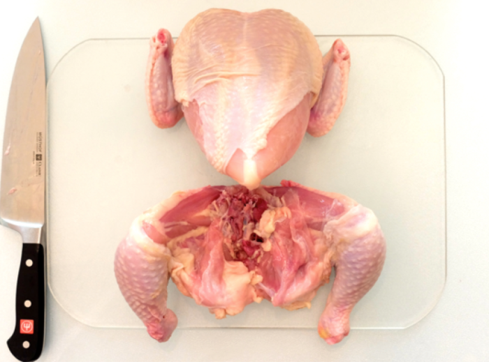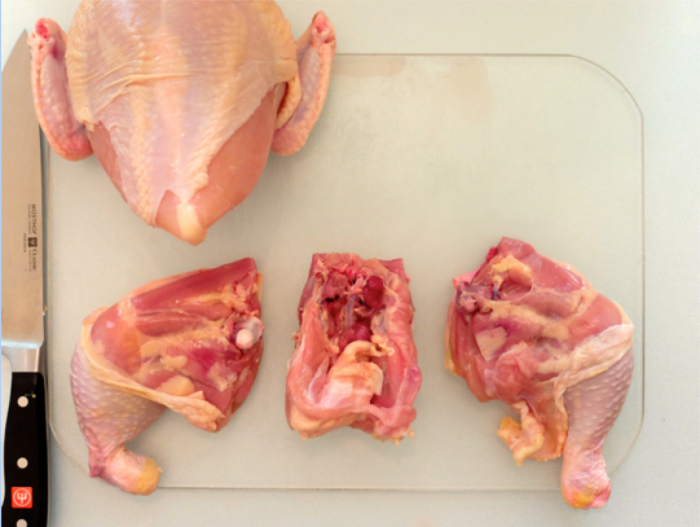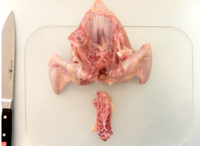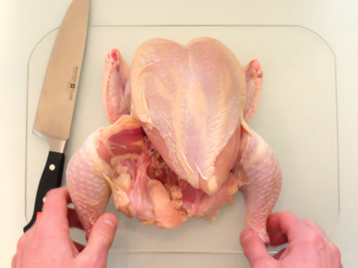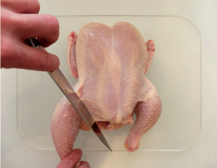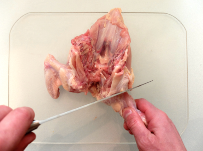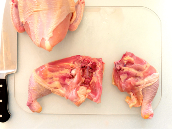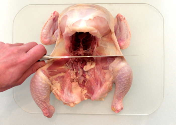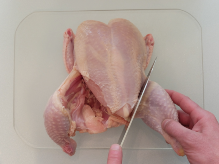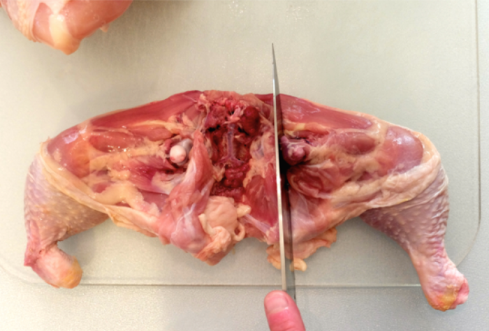 Place your bird back on your cutting board. With your knife, sever the two sections.