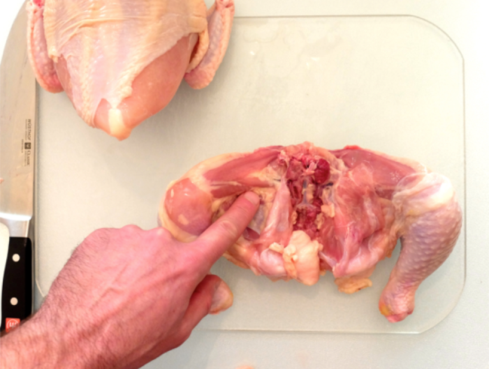 With your thumb on the backbone and your other thumb on the thigh bone, push the femur from the skin side, popping it out of the hip socket.