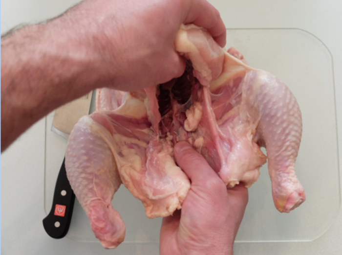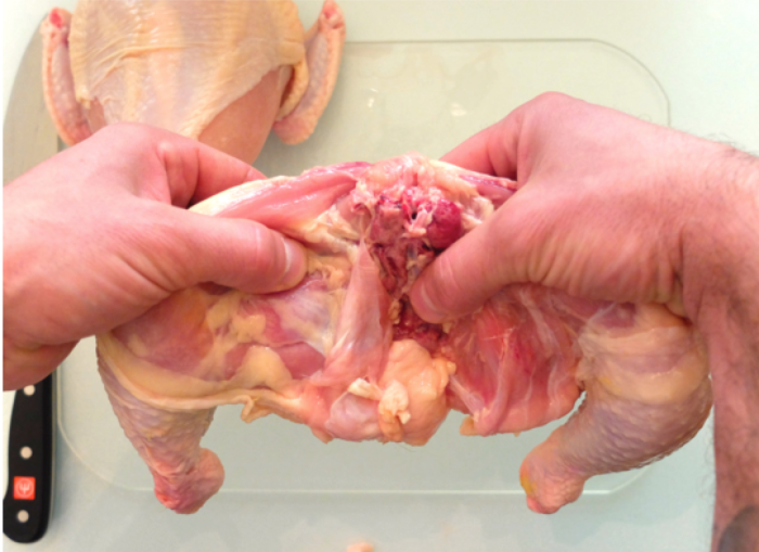 Now for the fun part. Holding the chicken with your thumb on the backbone and your other thumb inside the cavity pressing against the keel bone (sternum), snap the two sections in half. That's right, sever the spine between the lower and upper half of the bird. It should be fairly easy to do. Make sure you sever completely and that the only thing holding the two sections together is the skin.