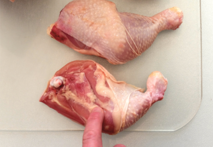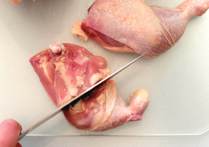 Now you've got two perfect halves. Let's continue working with the leg, thigh and back. Locate the thigh bone (femur) in the thigh, which is usually surrounded by a strip of fat.