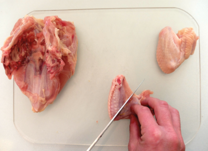 Let's get those wings off. The easiest way to explain where the joint is between the humerus (arm bone), the coracoid (collarbone) and scapula is to feel around your own body. Stick your hand under your armpit and move your arm up and down. Feel that articulation? Good — that's where you're going to cut on your chicken. Place your bird breast-side down and stretch the wing. Move it back and forth to feel the articulation between the joints. Place your knife where you see that movement and cut through. You should see the white of bone and tendon. With your fingers on the "backside" of the wing, push through the bone to sever the tendons. After a while, you'll be able to cut right through. This is applying the principles of my mentor Hans Sebald: "Use your fingers like a knife." Continue to cut all the way through, severing the wing.