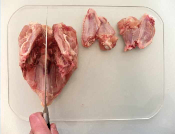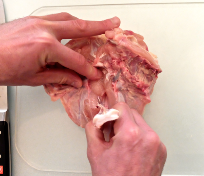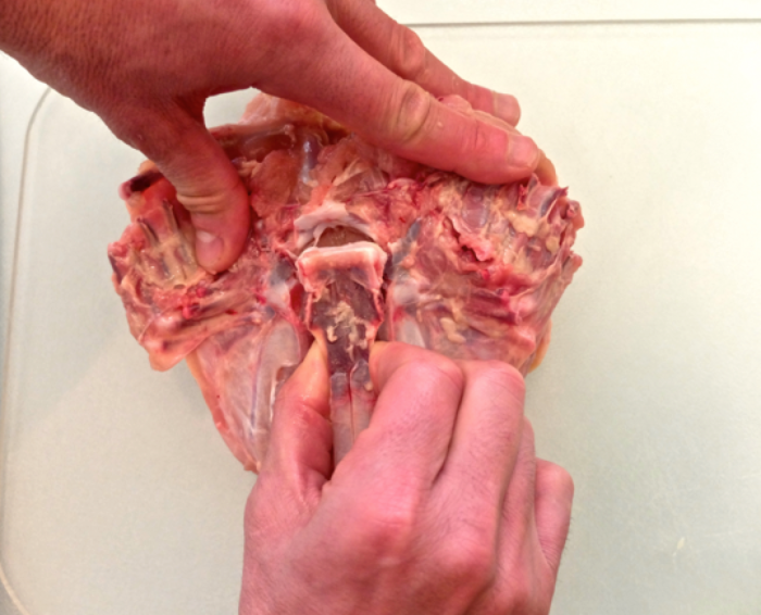 All that's left to do is to separate the two breasts. I've got two methods for you. The get-it-down method is first.