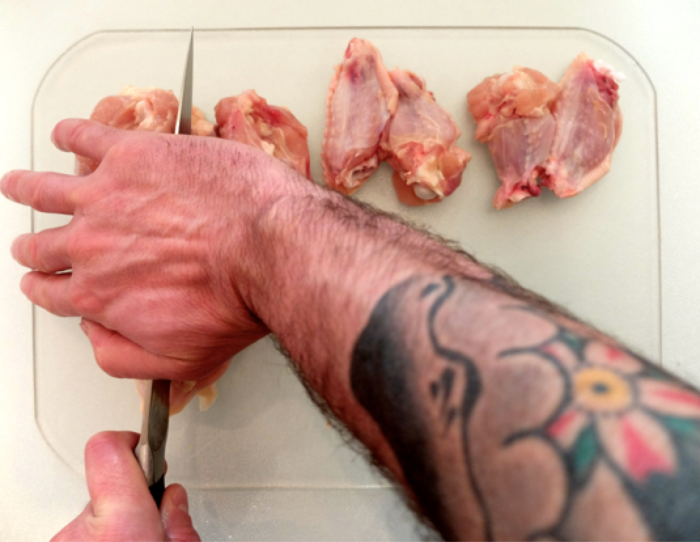 Similar to what you did above, we'll employ our own bodies to help us locate the joint between the humerus and the ulna and radius (the bones of the forearm). Pretend like you're curling and move your forearm toward your bicep. That area where you feel movement is the joint we're looking for. I've always called it the ditch, which, in tattoo-speak, means one of the most painful places to get a tattoo. At least it was for me. So, once again, place your knife on the joint and cut through. You can use your fingers like a knife here and snap the joint loose until you get comfortable locating it.