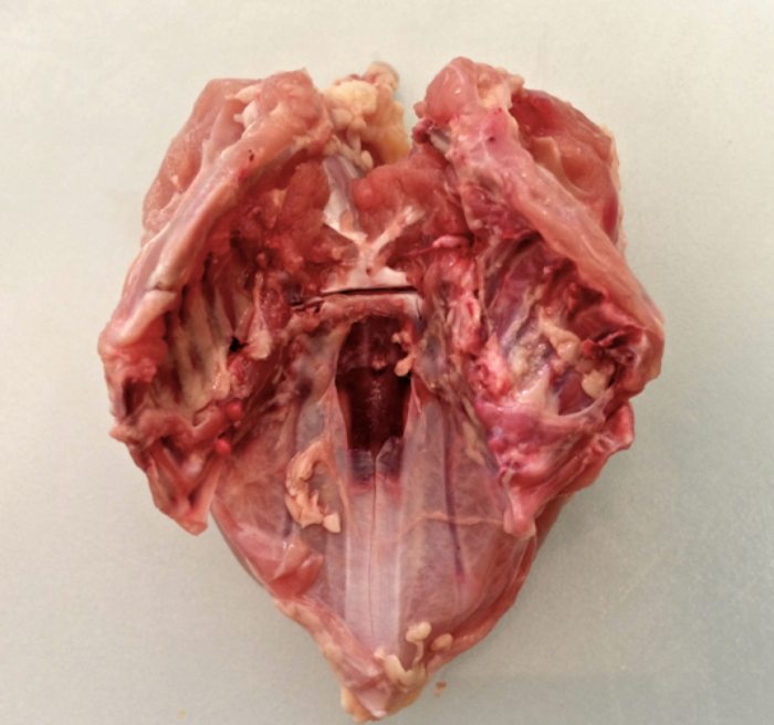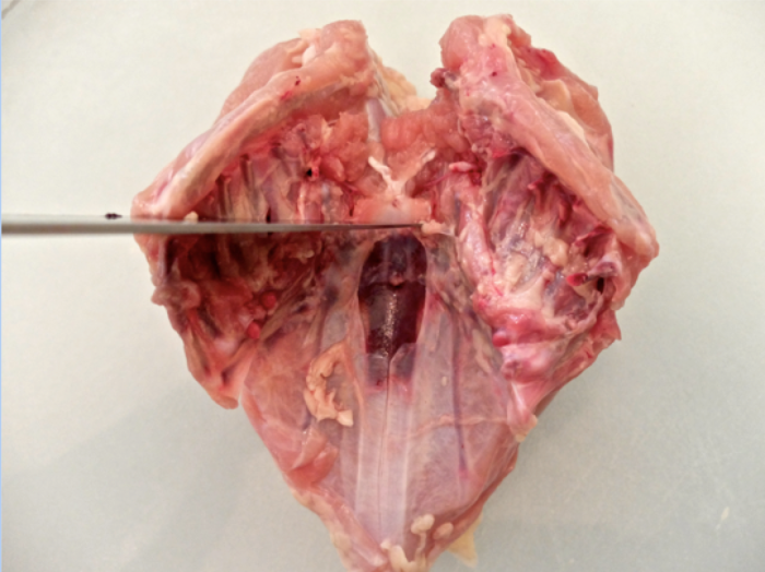 At the top of the sternum, you should see a bit of cartilage. You're going to make a horizontal cut across the cartilage, applying some pressure, but make sure not to cut down into the breast. We simply want to separate the sternum from this cartilage.