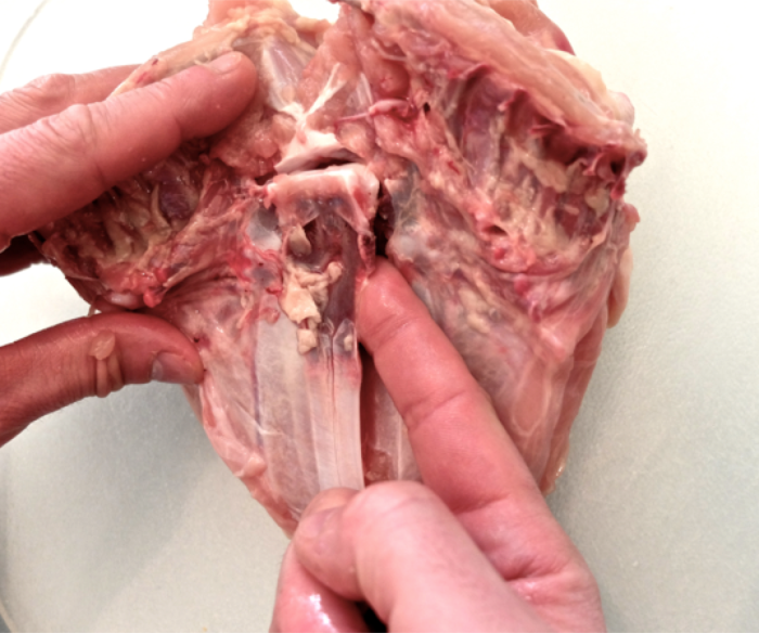 As the sternum starts to pull away from the fascia and the muscle, place your finger gently underneath and slide along the length of the keel bone toward the cartilage. Do this on both sides of the sternum.