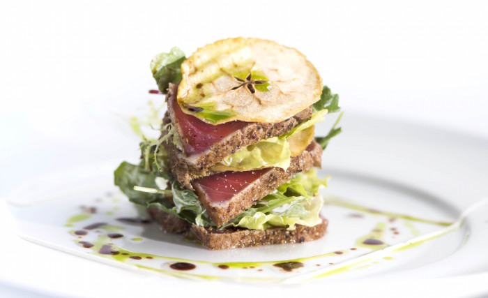Let's start with that lobby-adjacent glass-encased pastry room mentioned earlier. I had a macaron the size of a softball that had just the right amount of sweetness, mixed with a little nutty saltiness, and a shell that I couldn't believe held up at that size. I had the pleasure of eating lunch at the hotel café and was really impressed with the menu. One standout dish in particular was the seared rare tuna with thin slices of baked apple — a clever pairing that I wasn't sure would work, but which proved to be delicious.