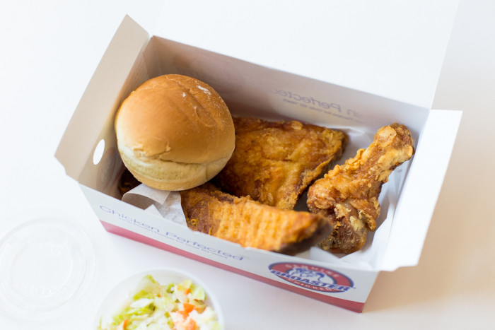 You can't imagine how happy I was to discover that Old World Deli in Upland has broasted chicken. I didn't know broasted chicken existed until I heard about it from a friend while on a fried chicken crawl. Broasted chicken is cooked in a pressure fryer, a method invented by L.A.M. Phelan, who later founded the Broaster Company. My friend and I didn't have any luck finding broasted chicken in New York City, so for me to find it in Upland was surprising. The fried chicken is cooked to order, but the 15- to 20-minute wait is well worth it. Order a two- or three-piece meal, which comes with two giant potato wedges, a roll and a side. I love that chicken, not because it's served in an old-school red-and-white takeout box, but it kind of reminded me of childhood, when KFC was still Kentucky Fried Chicken.