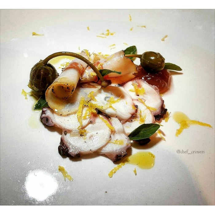 Wine infusion isn't limited to pork-based charcuterie, either. After braising an octopus in red wine for octopus carpaccio, Crinieri removed the gelatinous parts and much of the braising liquid and rendered it down to an aspic. "Octopus was definitely still at the forefront, but you needed that wine to round it out," he points out. "Had I just done a straight octopus aspic, it would have been one-note, very overpowering." Next, he plans on doing a bresaola — cured beef — with a wash in red wine.