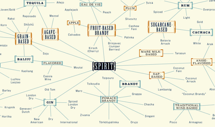 From the good folks at Pop Chart Lab who brought you a wheel of all the cheeses and a comprehensive guide to beer comes the most comprehensive alcohol map ever created. Behold: the taxonomy of booze both fermented and distilled, painstakingly organized by base ingredient or region of origin. Are sake and soju related? Quick, name all the fortified wines! Wait, you can make booze out of mare milk? What the hell is pomace brandy? Just think of all the conversation starters!