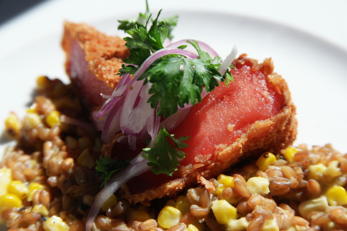 "We love crimson watermelon because not only is it local, but the size is not too large and the moisture content isn't too high," says Sawyer. "This makes it versatile for preparations other than just slicing and eating." One way the chef prepares the Crimson Sweet is by turning it into country fried watermelon (recipe below), a dish that pays homage to vegan cooking in the South. "What started initially as a joke became a delicious dish," the chef says. "It's a riff on a vegan dish and it's supposed to be like a crispy fried tuna." It is essentially, as you might expect, breaded and fried watermelon.