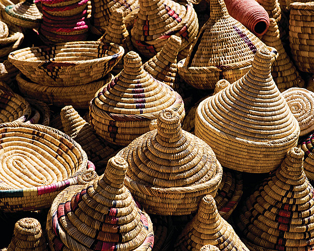 Handmade baskets fill every narrow alley in Moroccan souks, or markets. Handwoven from wicker, the baskets are bright and colorful, ranging in size from tabletop decorations to enormous bulk spice bins. They're often used as bread baskets in Morocco, and I recommend the same application. Take a stab at a traditional Berber skillet bread and show off your handiwork in a wide, open-brim basket. I prefer one with bright colors and patterns to contrast with a minimal, white place setting. For an extra layer of texture, loosely wrap the breads in a linen towel in the basket, which will help keep them warm.