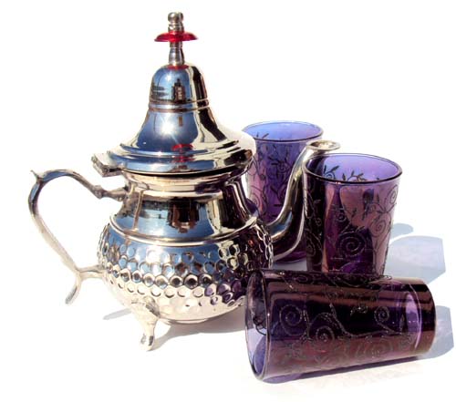 I love the combination of curvaceous, polished steel kettles with delicate, richly colored glassware. (Moroccan sets don't use teacups.) I suggest perusing eBay for authentic sets with funkier shapes and hand-painted glasses with metallic inflections. Mass-produced copies from large retailers will feel sterile and generic, and a true tea service is anything but.
