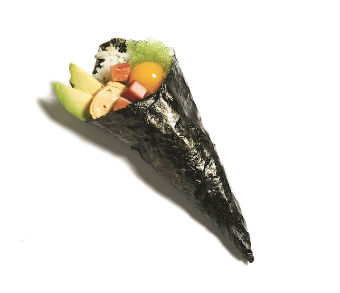 2. Hamagatchi: hand roll with wasabi tobiko, avocado, diced ginger ham, and quail egg