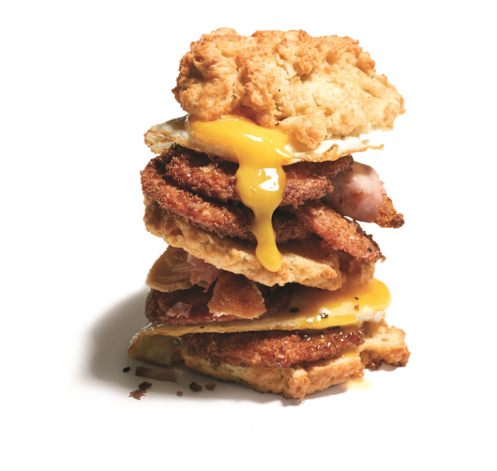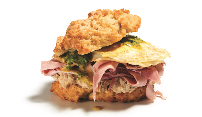 7. Going Ham: a double-decker biscuit of chicken-fried ham and ham-fried chicken, with sunny-ups