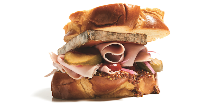 9. Hamdlebar Mustache: house-smoked honey ham, house-made beer mustard, house-made pickles, house-made egg bread, super-local peasant cheese, and Sriracha