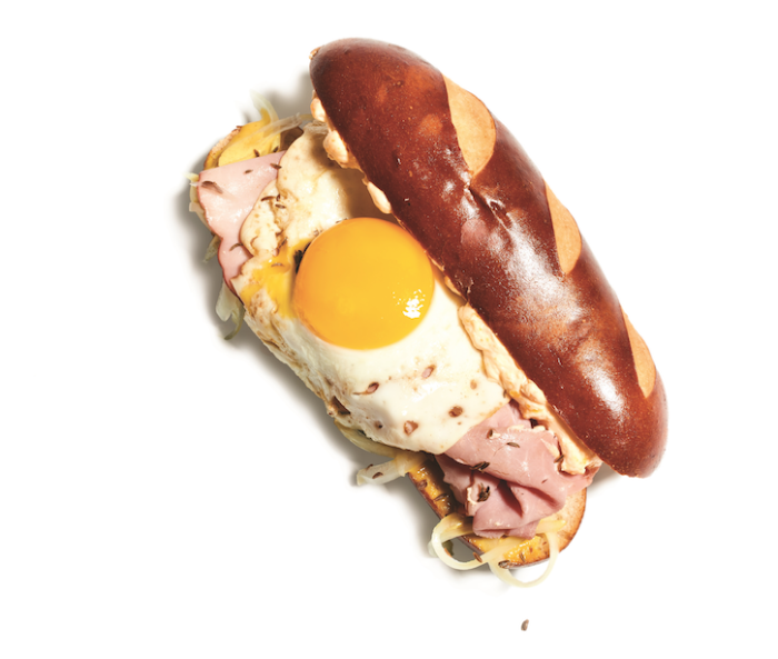 10. Der Hammeister: Bavarian beer cheese, caraway pickled onions, Black Forest ham, Hamburg hot mustard, and a fried egg on a pretzel roll