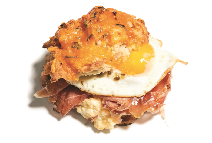 11. Bourbon Boy: Benton's country ham, stone-ground grits, and fried egg on a jalapeno-cheddar biscuit with jalapeno jelly and sorghum on the side