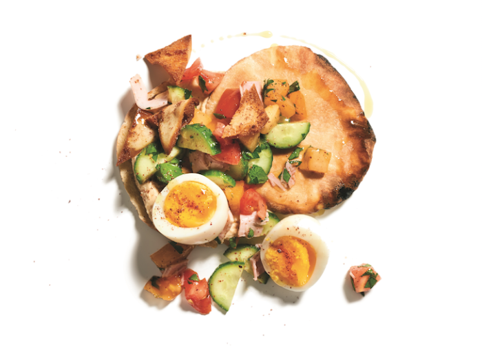 13. Hamson and Delilah: hummus, sliced hard-boiled egg, turkey ham, and fattoush on pita