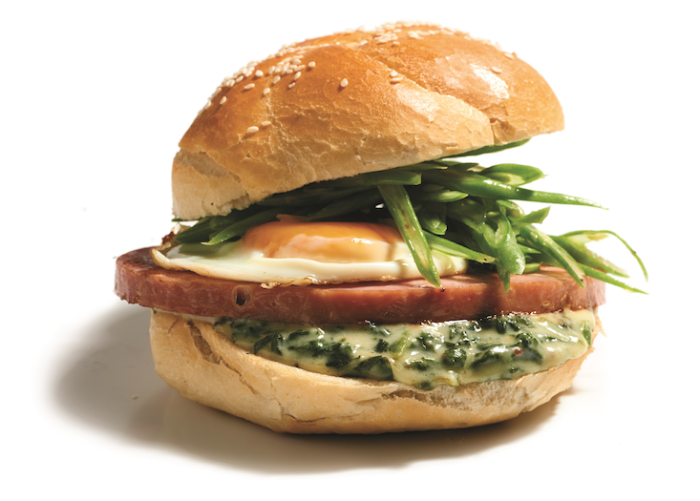16. I Ham What I Ham: ham steak with creamed spinach spread and shaved green bean slaw on a sesame seed Kaiser roll, with olive oil on the side